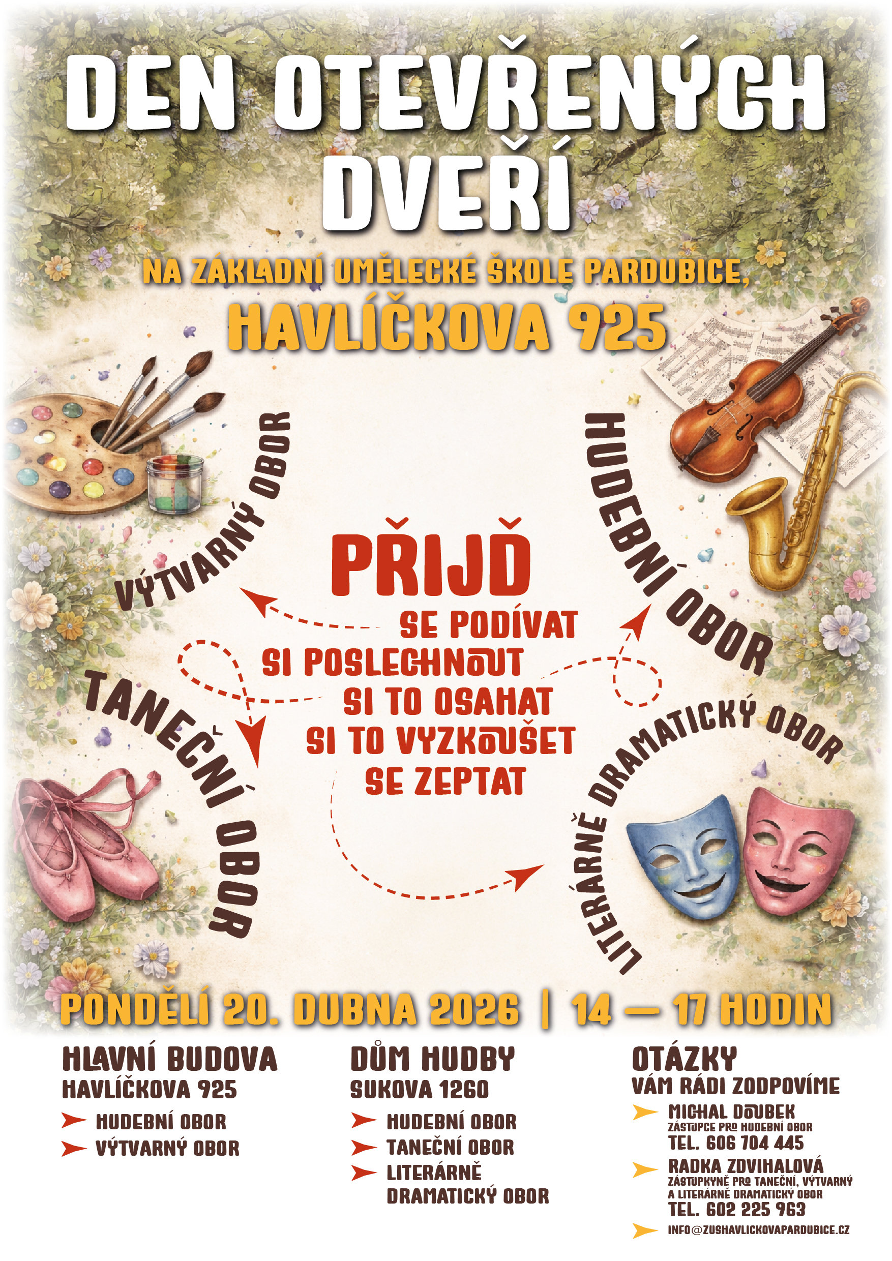 Základní umělecká škola Pardubice, Havlíčkova 925 pořádá v pondělí 20. dubna 2026 Den otevřených dveří. Chcete-li zjistit, jak to u nás chodí na hudebním, tanečním, výtvarném či literárně dramatickém oboru, příjďte se v tento...