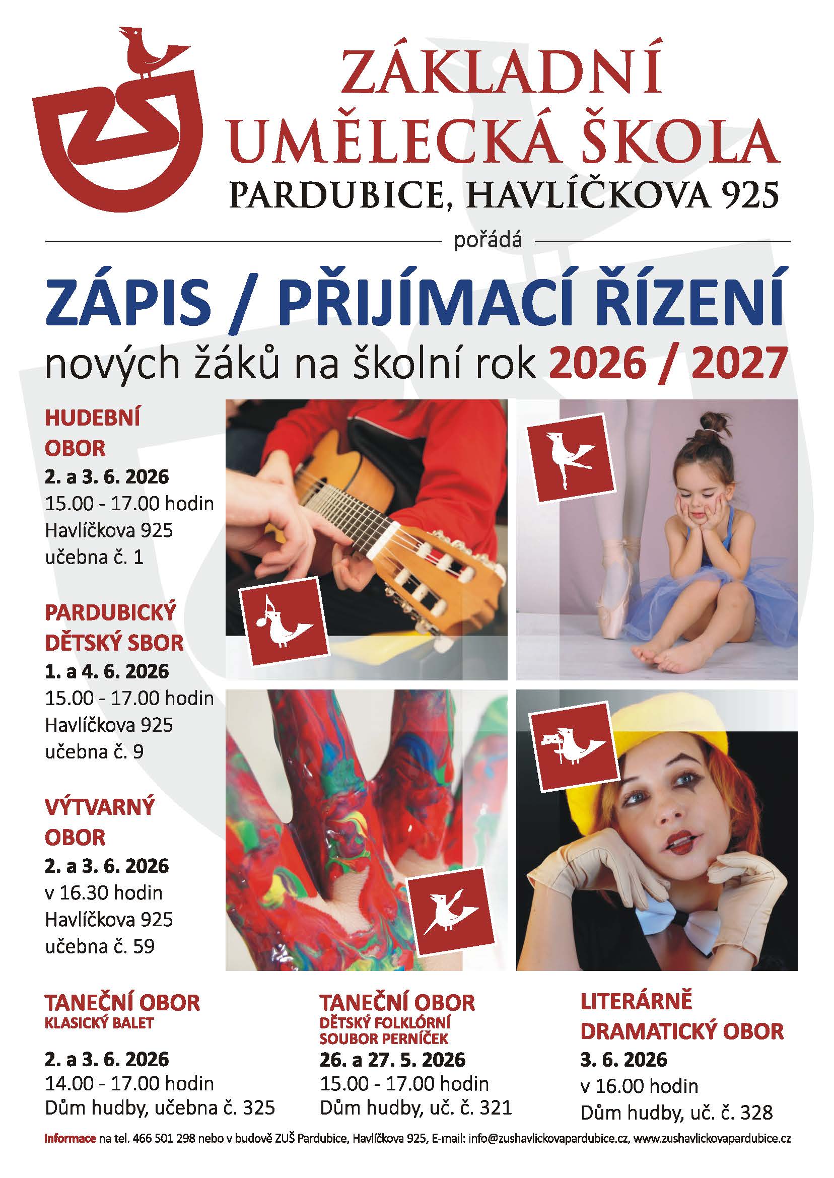 Vážení rodiče, milé děti,přijměte naše pozvání k Zápisu / přijímacímu řízení nových žáků na školní rok 2026/2027. Těšíme se na viděnou!Kolektiv zaměstnanců ZUŠ Pardubice, Havlíčkova 925...